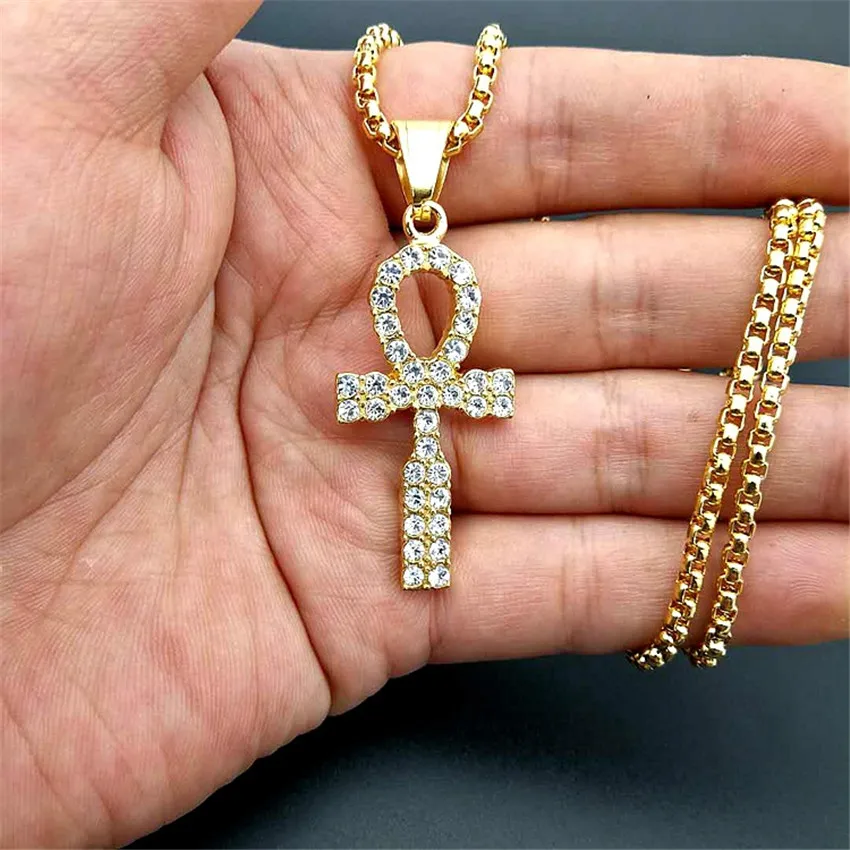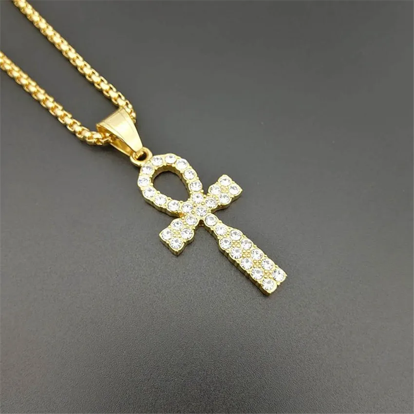 Best Egyptian Neck Ankh Cross Pendant Necklace For Woman/Men Hip Hop Iced Out Rhinestones Stainless Stee