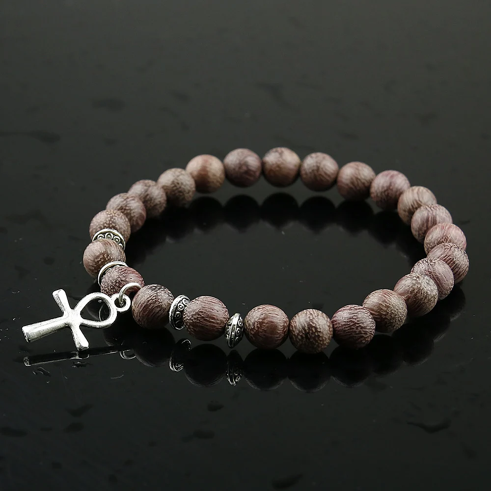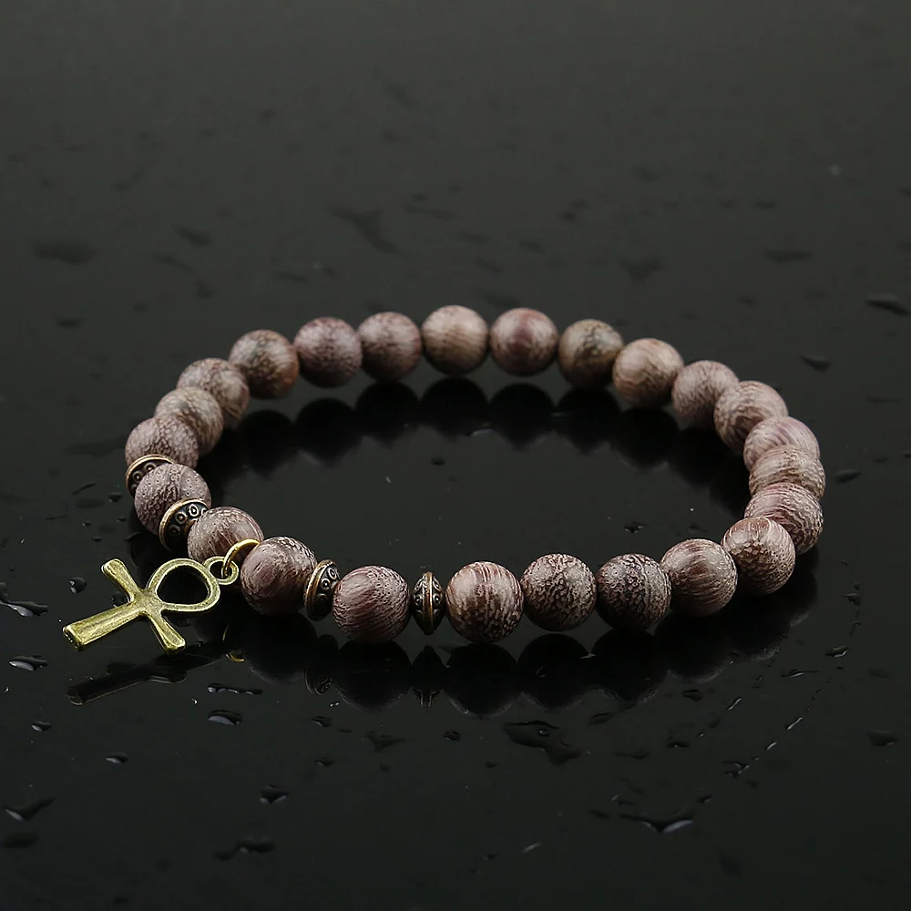 New Men Wood Beads Bracelets Natural Violets Wood Egyptian Ankh Cross Bead Bracelet Wooden Women Girls