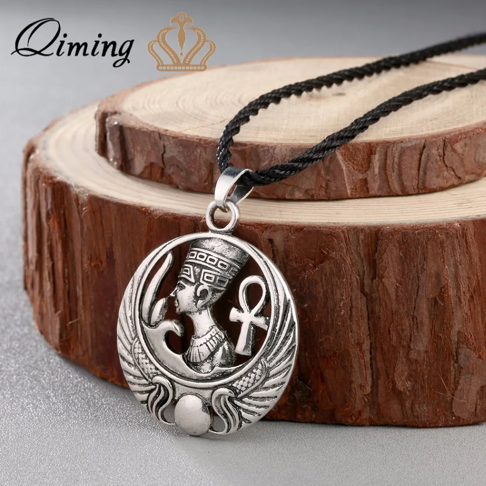 Promo QIMING New Boho Necklaces For Women Egyptian Queen Egypt Nefertiti Pharaoh Ankh Scarab Pendant Silv