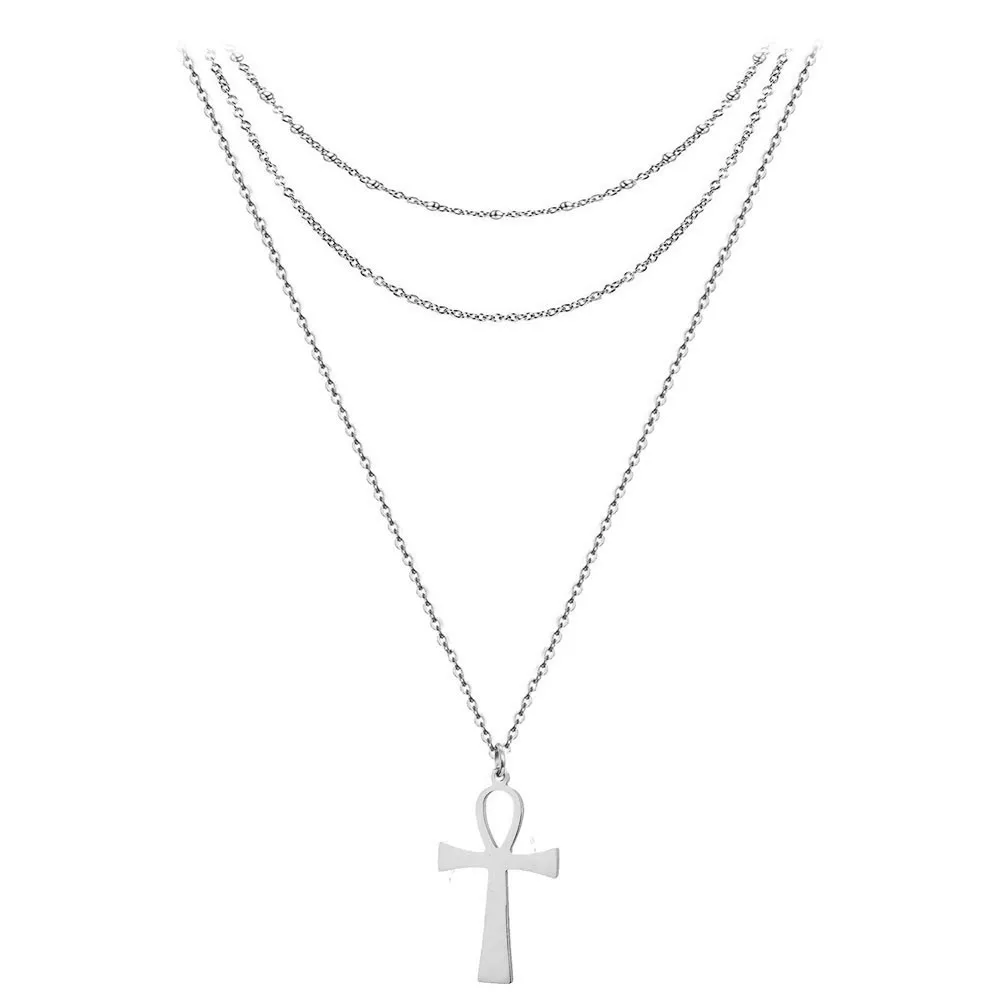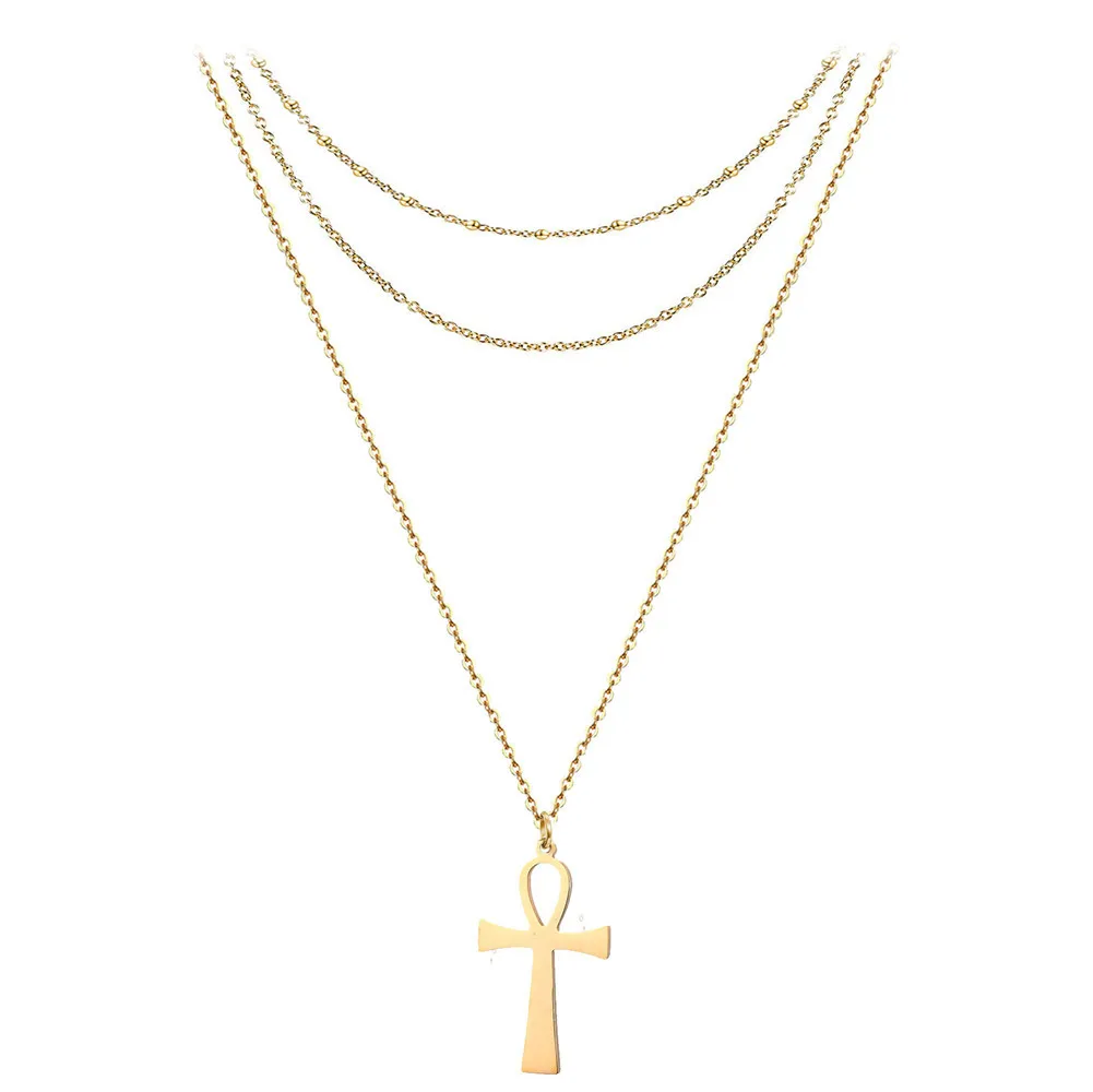 Best Stainless Steel Gold Silver Color Ancient Egypt Cross Ornament Layered Simple Thin Necklace 3 Layer