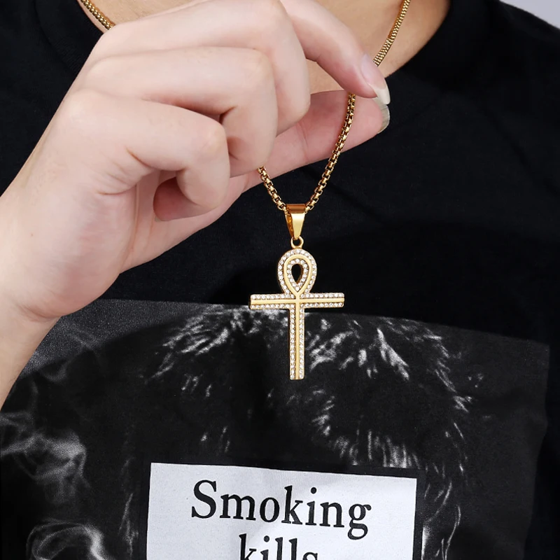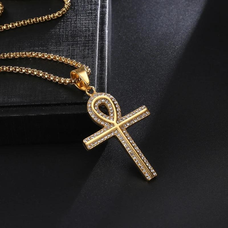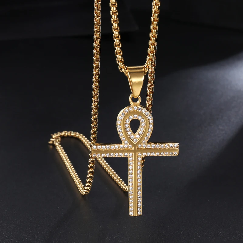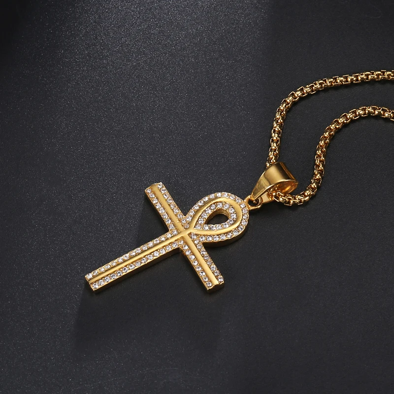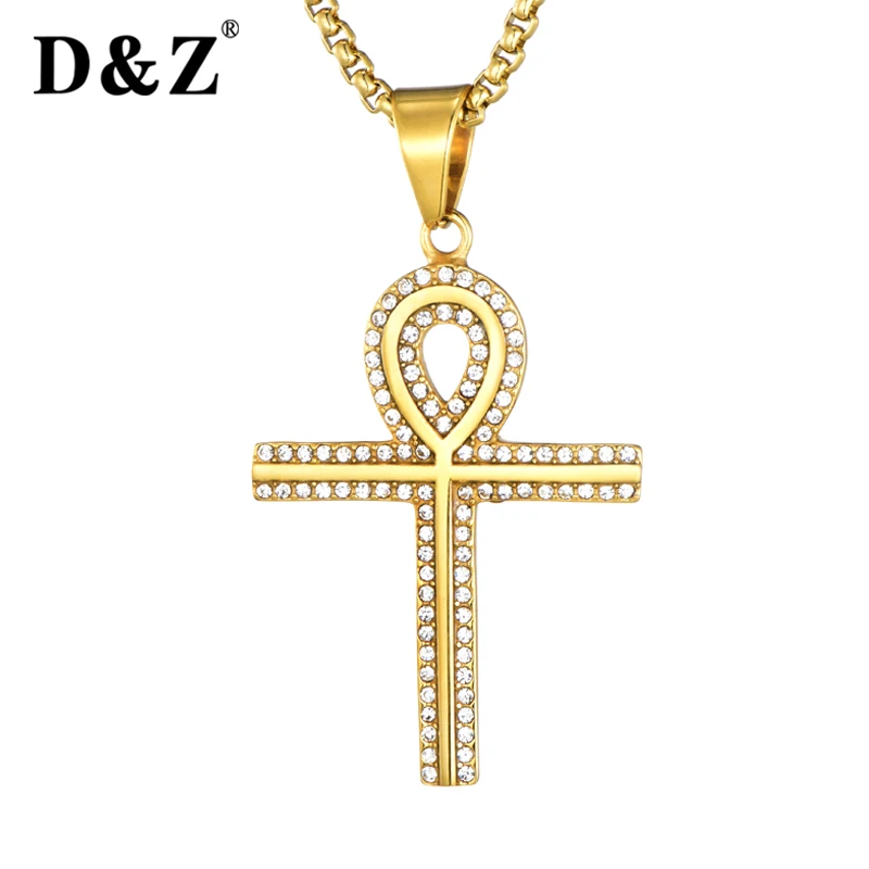 Best D&Z Gold Color Ancient Egypt Bling Crystal Ankh Cross Necklaces Stainless Steel For Men Woman Valen