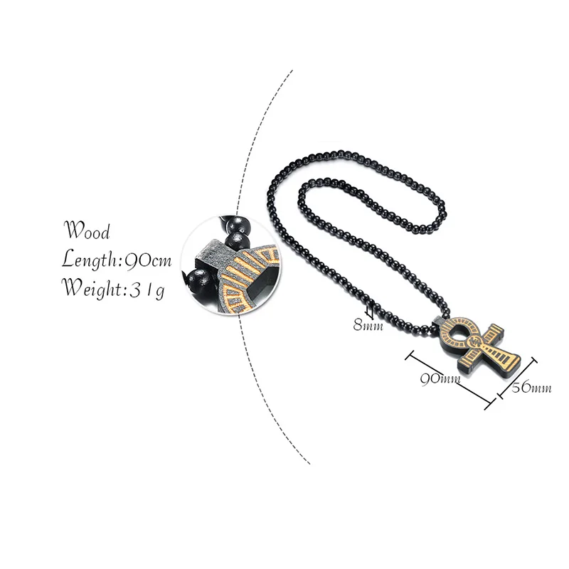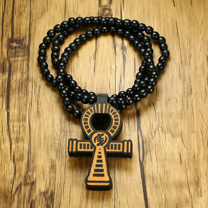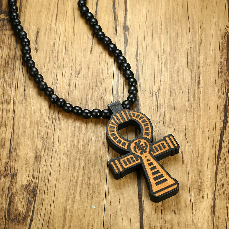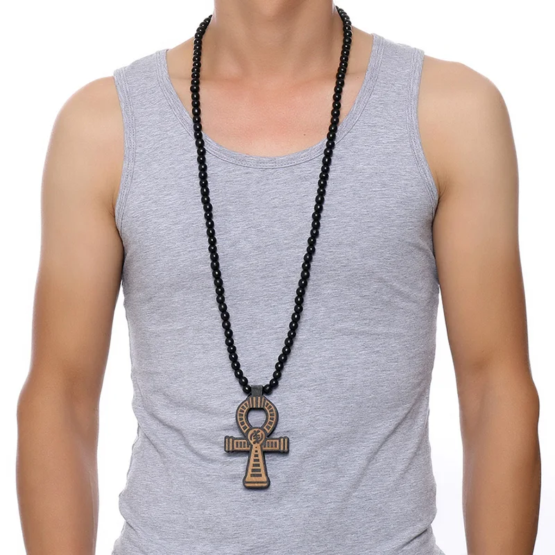 New Meaeguet Carving Ancient Egypt Ankh Pendant Necklace For Men Amulet With 8mm Wood Beads Chain Lengt