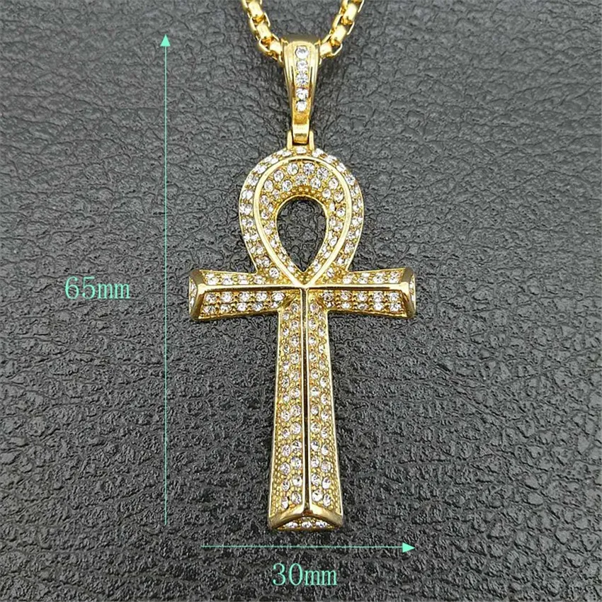 New Men's Egyptian Ankh Cross Pendant With Stainless Steel Chain And Iced Out Bling Full Rhinestones Ne