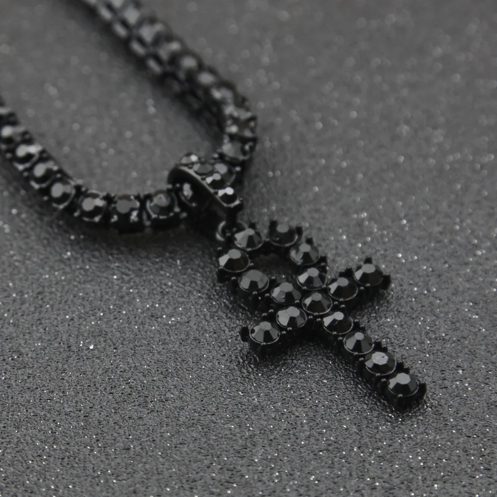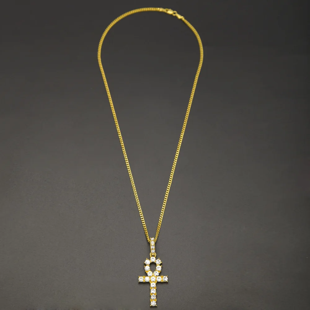 Promo Ankh Silver Mens Women Hip Hop Iced Out Gold Rhinestone Key of Life Egypt Cross Pendant Tennis Chai