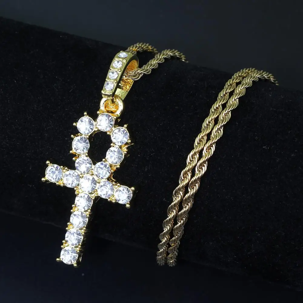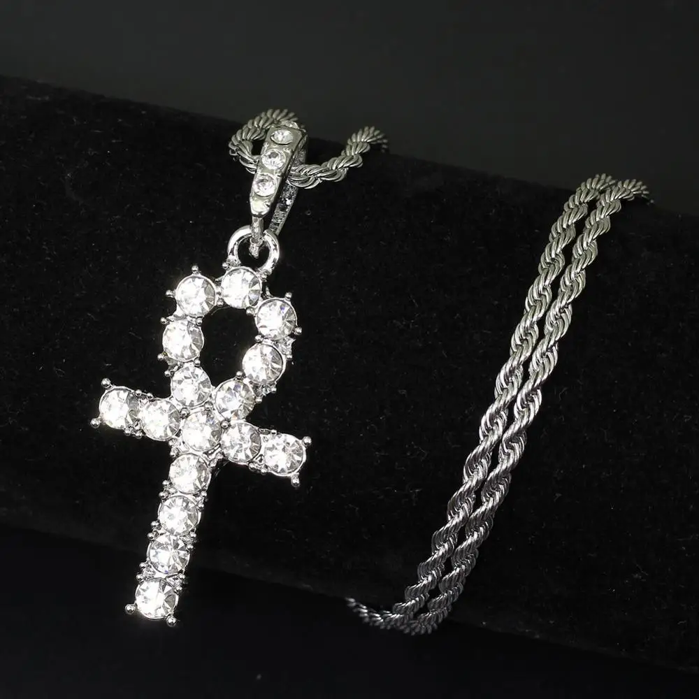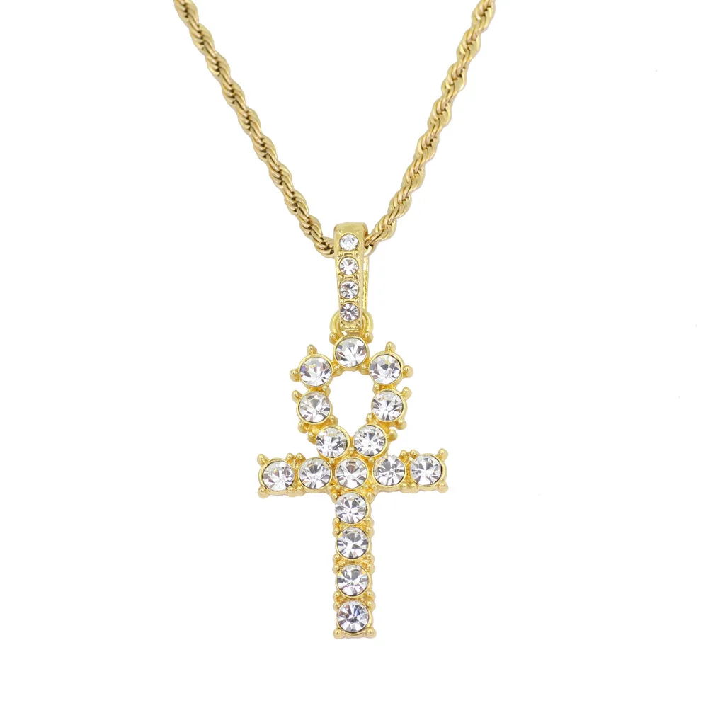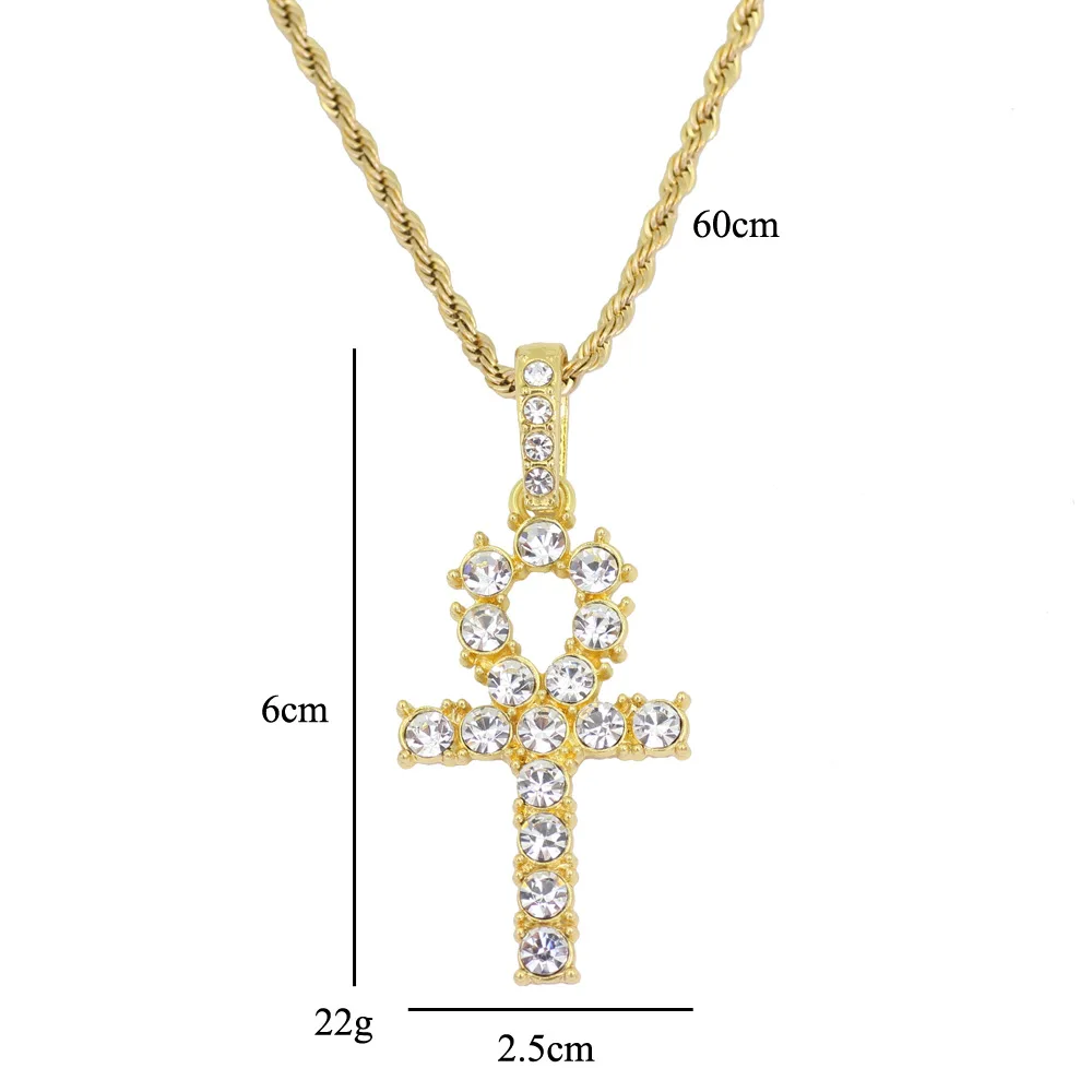 Promo Hip Hop Necklace Alloy Gold Silver Rhinestone Egypt Ankh Anka Cross Pendant With 24 inch Stainless