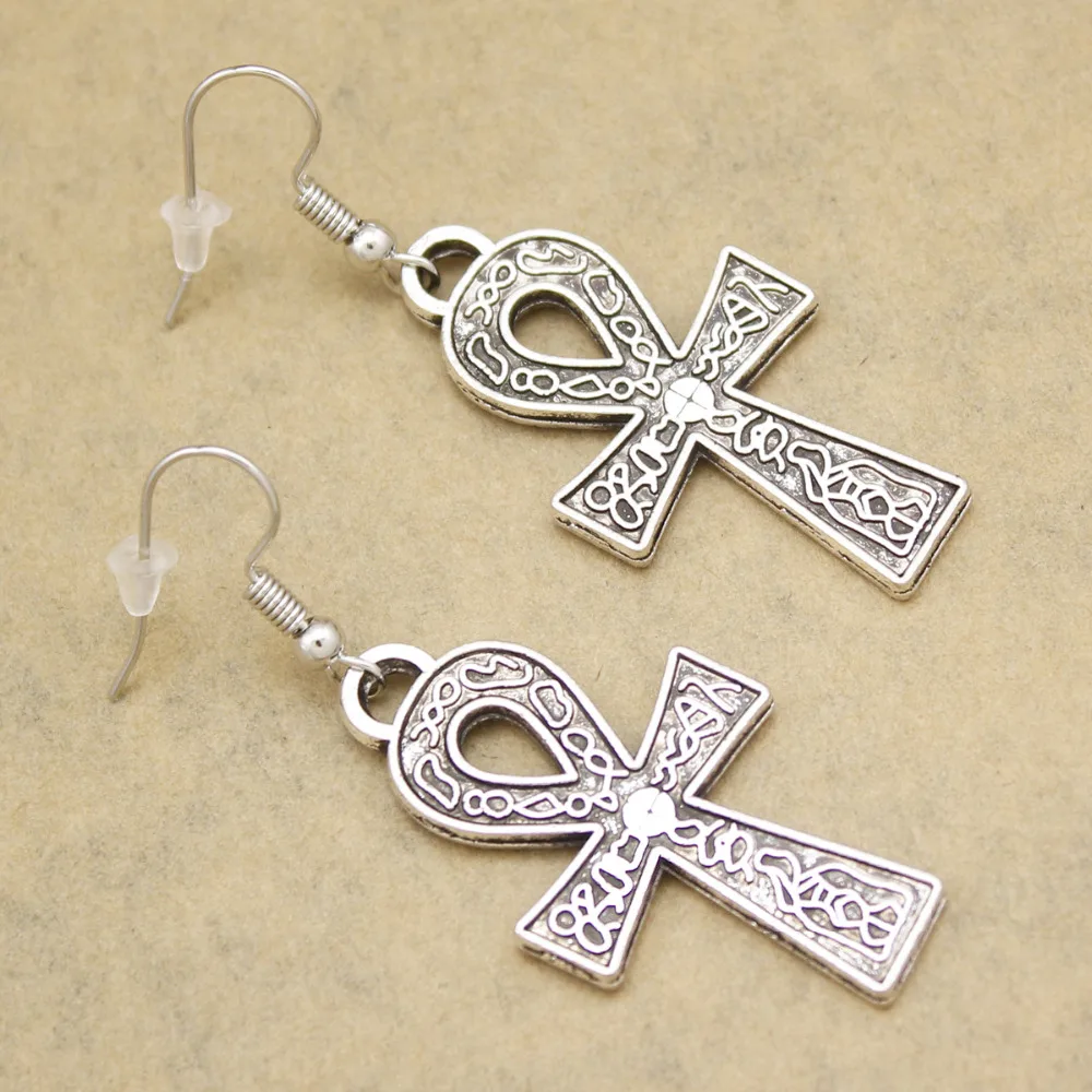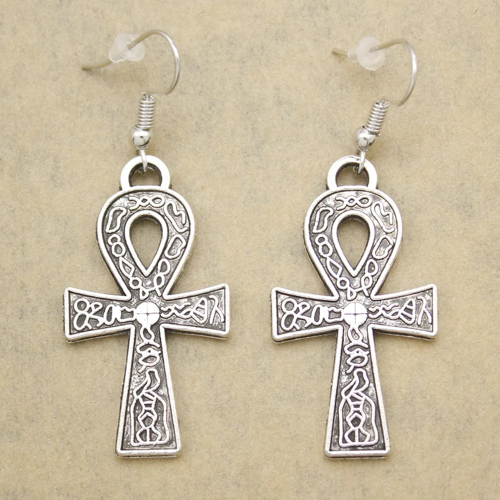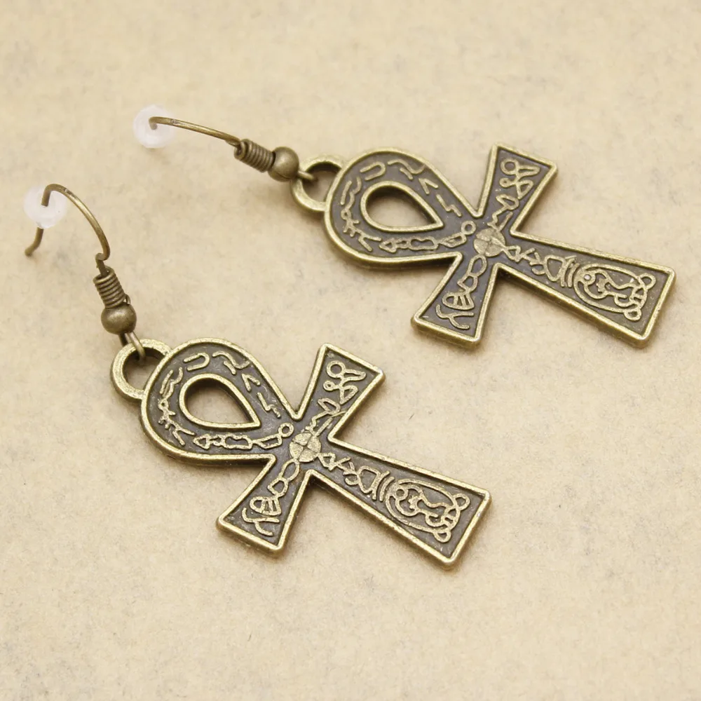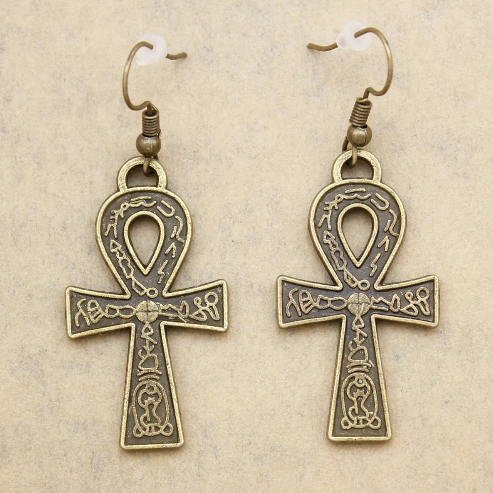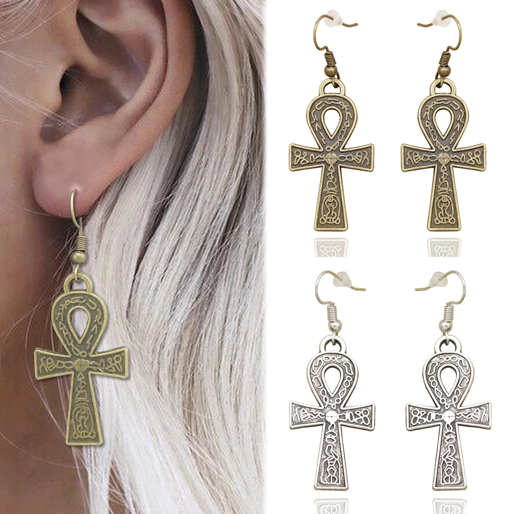 Promo Vintage Retro Gold Silver Egypt Cleopatra Ankara Hieroglyphic Ankh Cross Metu Dangle Earrings Women
