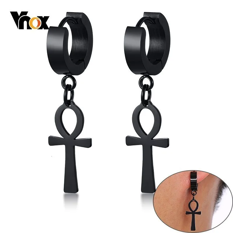 Promo Vnox Mens Ankh Cross Egypt Cleopatra Earrings for Women Unisex Jewelry Antiqued Black Stainless Ste