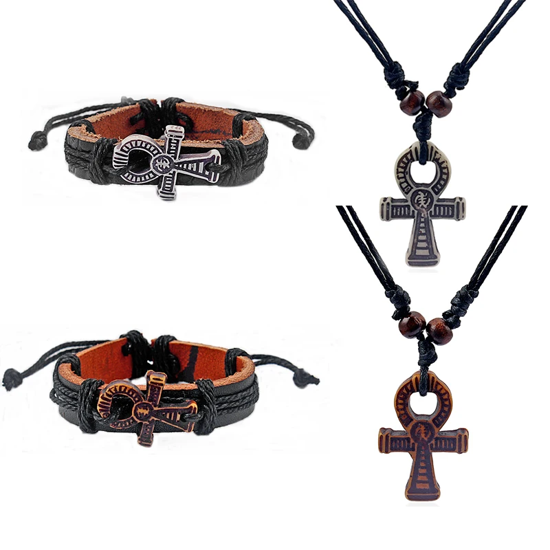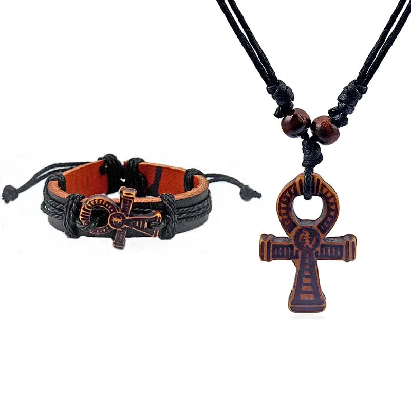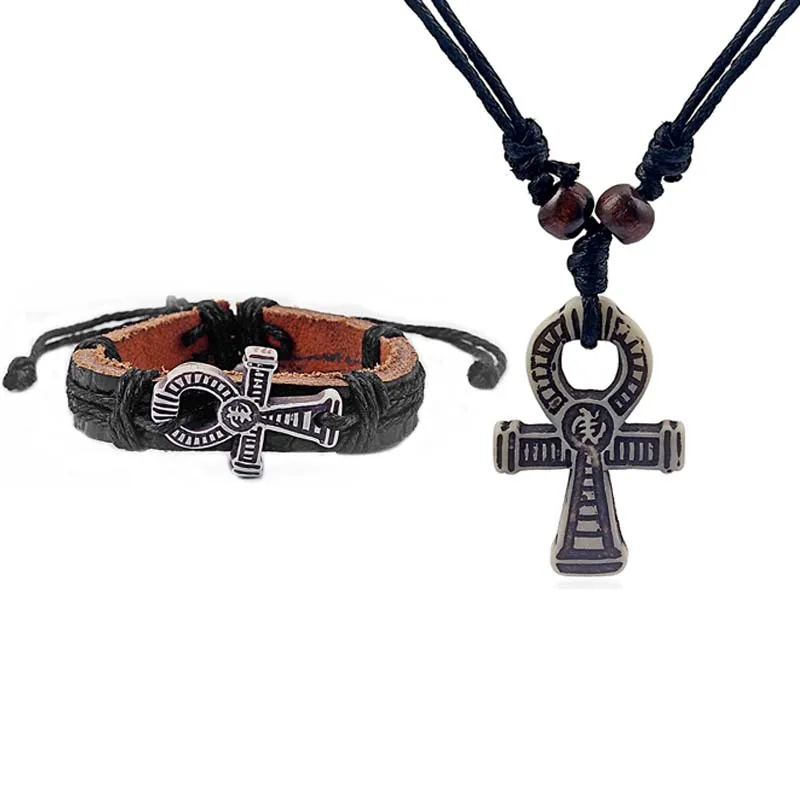 Best Drop Shiping 1sets White & Brown Resin Egypt Ankh Cross Genuine Leather Bracelet Bangle Wristband &