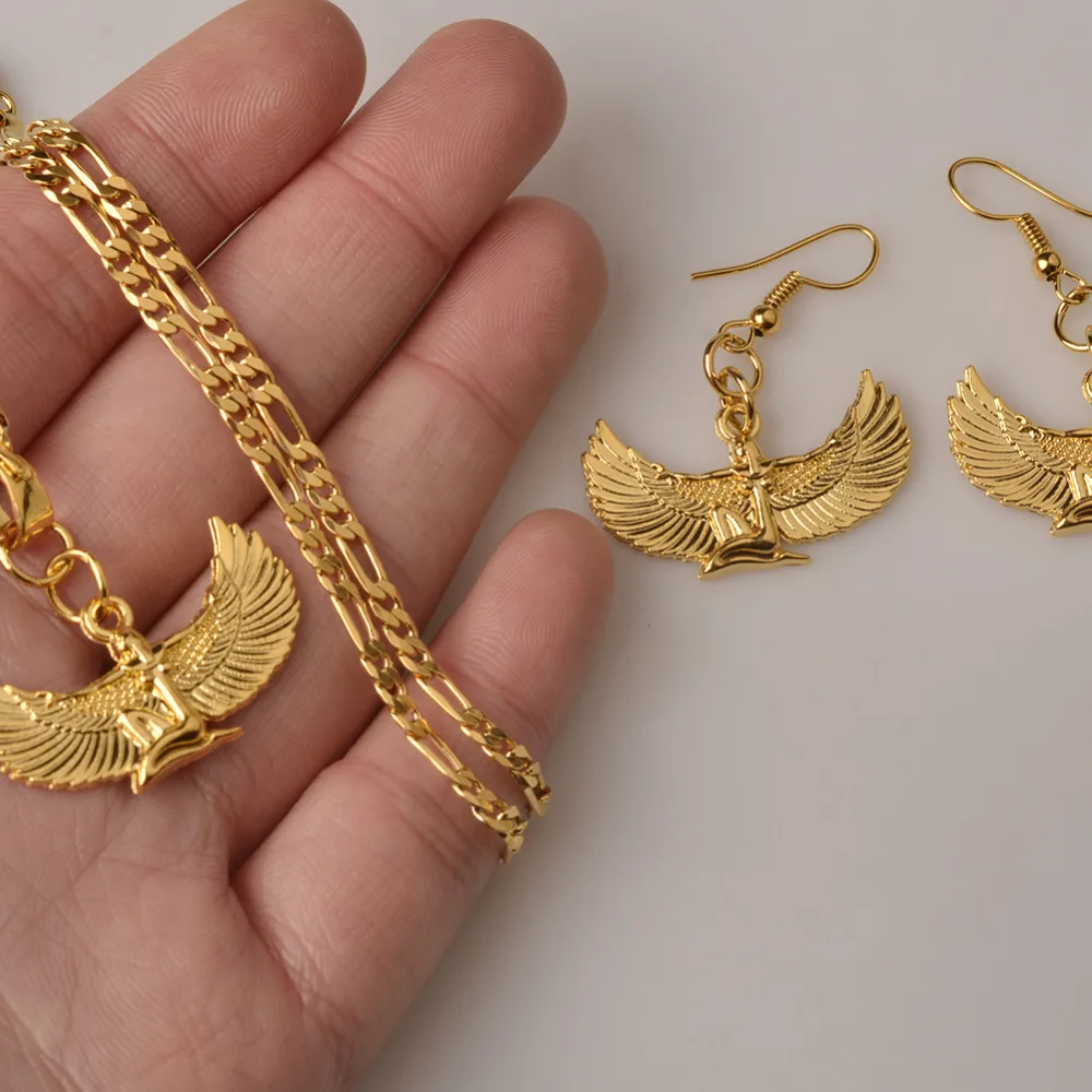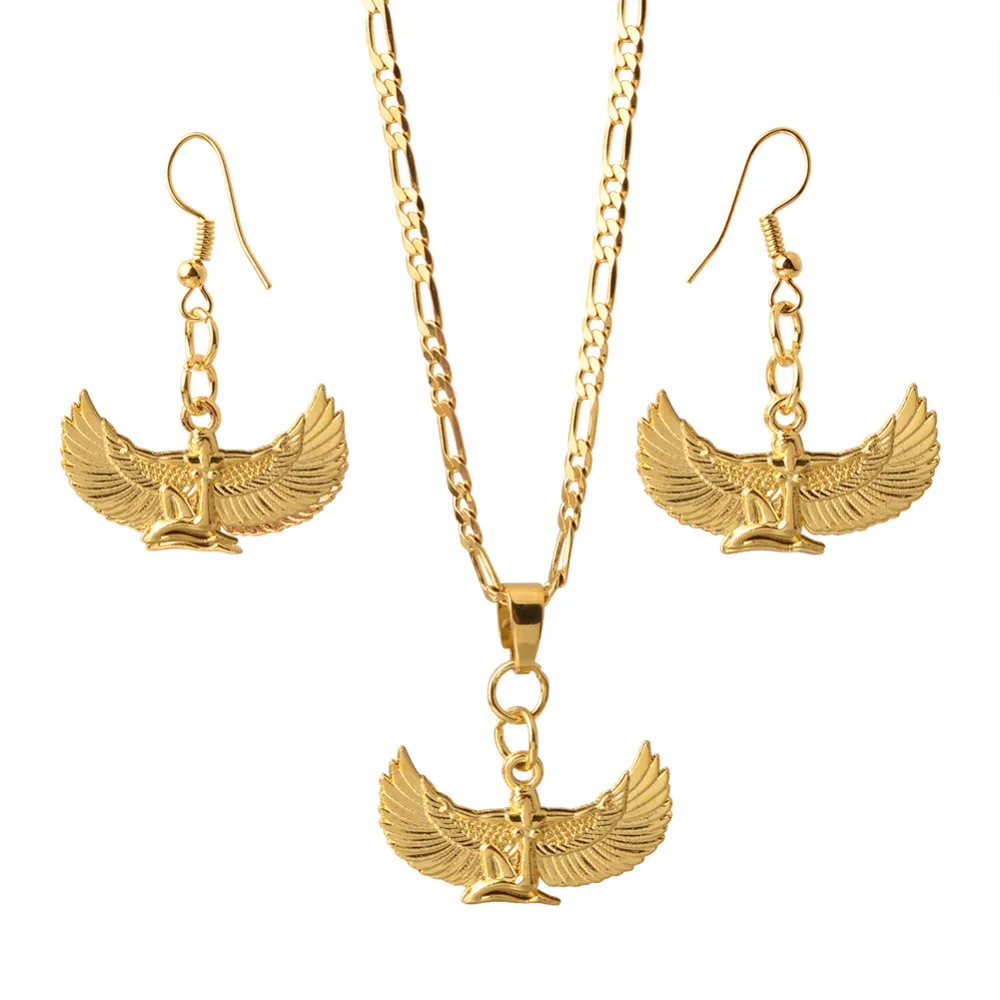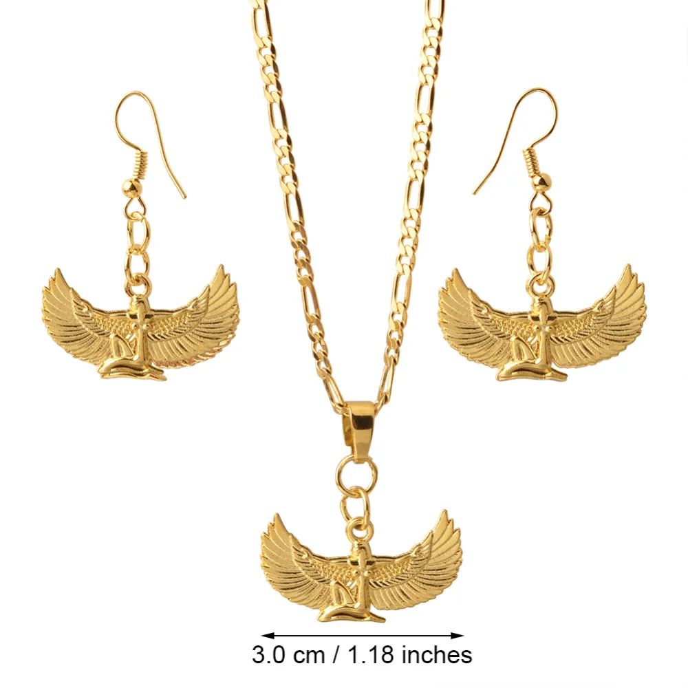 Best Egypt Religion Goddess Gold Color Necklace Earrings sets Wing Ankh Bib Wicca Pagan Necklace Jewelry