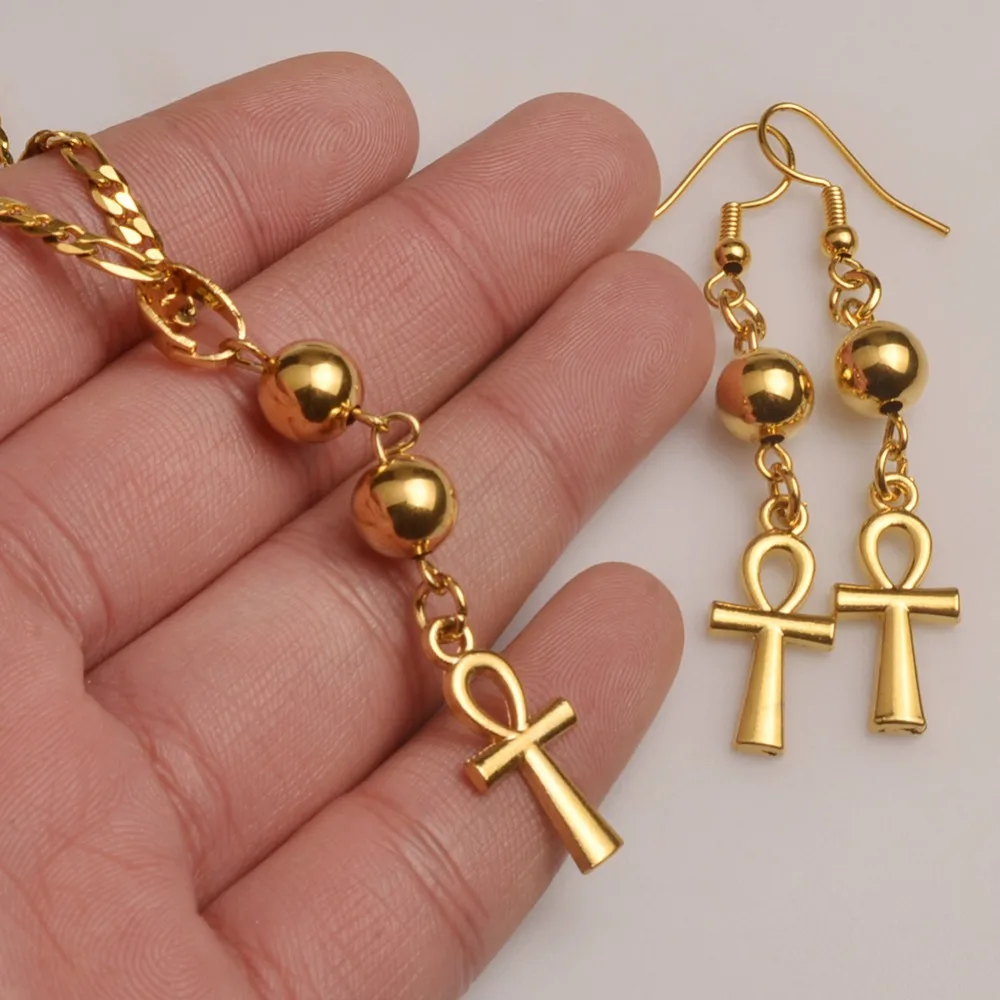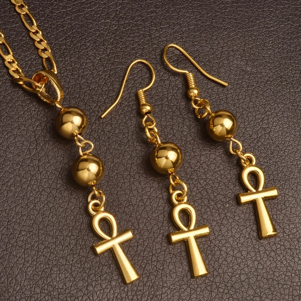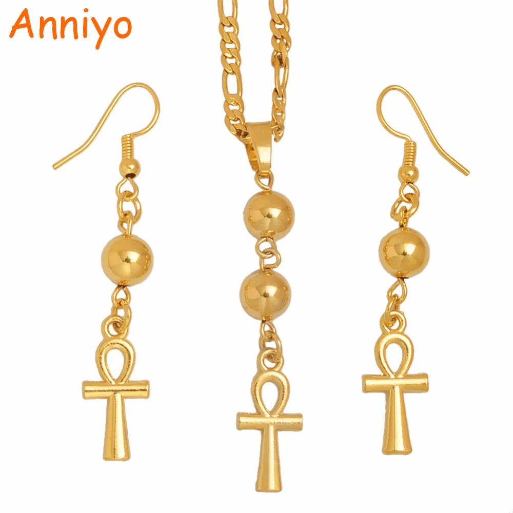 Promo Anniyo Egyptian Ankh Cross Necklace Earrings for WomanGold Color African Egypt Hieroglyphs Jewelry