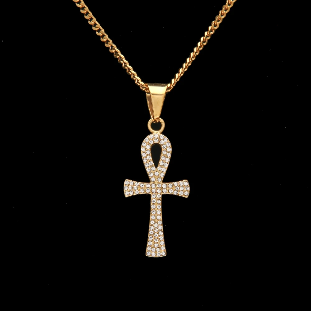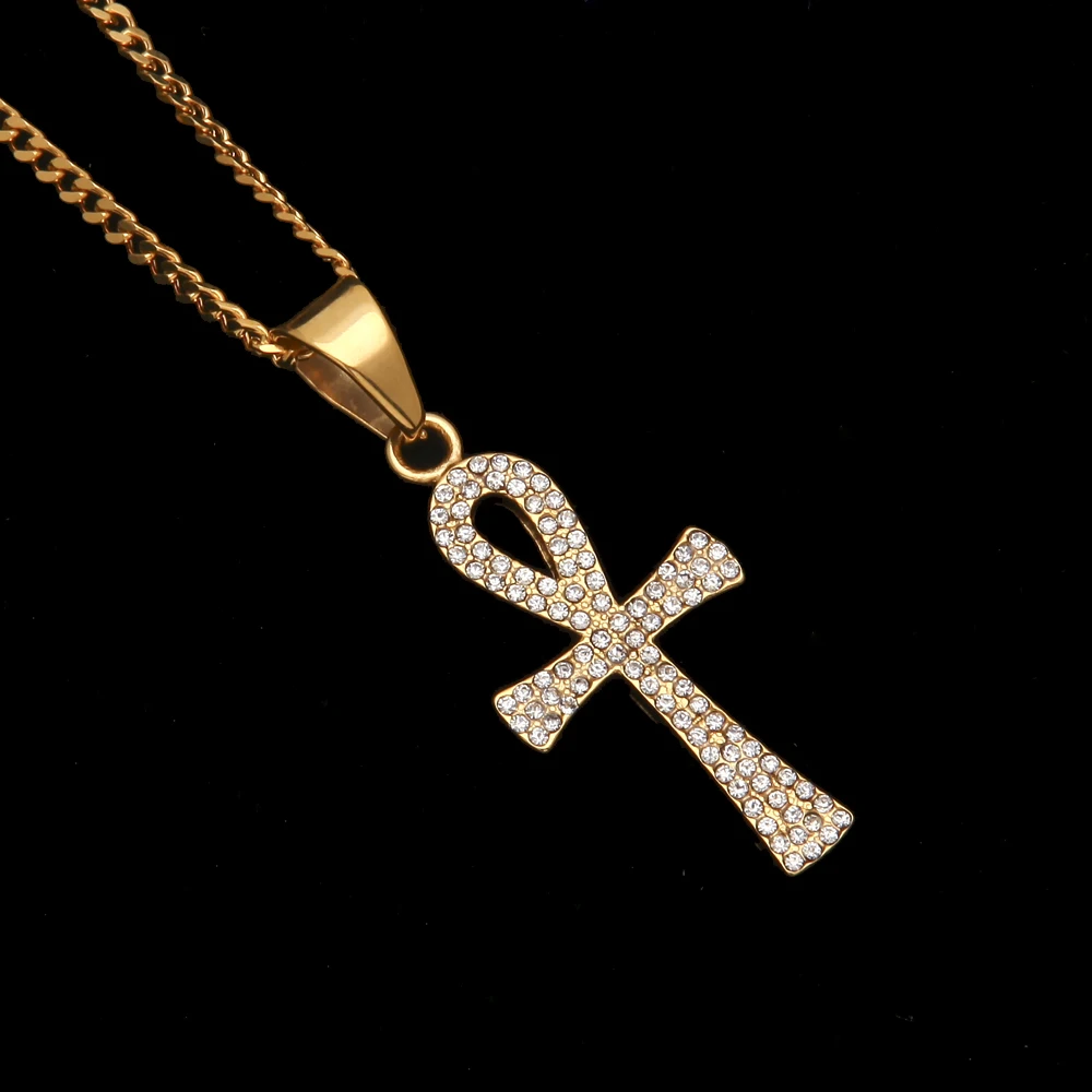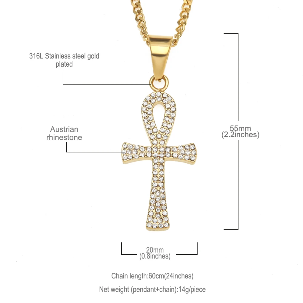 New Uwin Ankh Pendants Key Of Life Cross Pendant & Gold Cuban Chain Full Iced Out Rhinestones Stainless