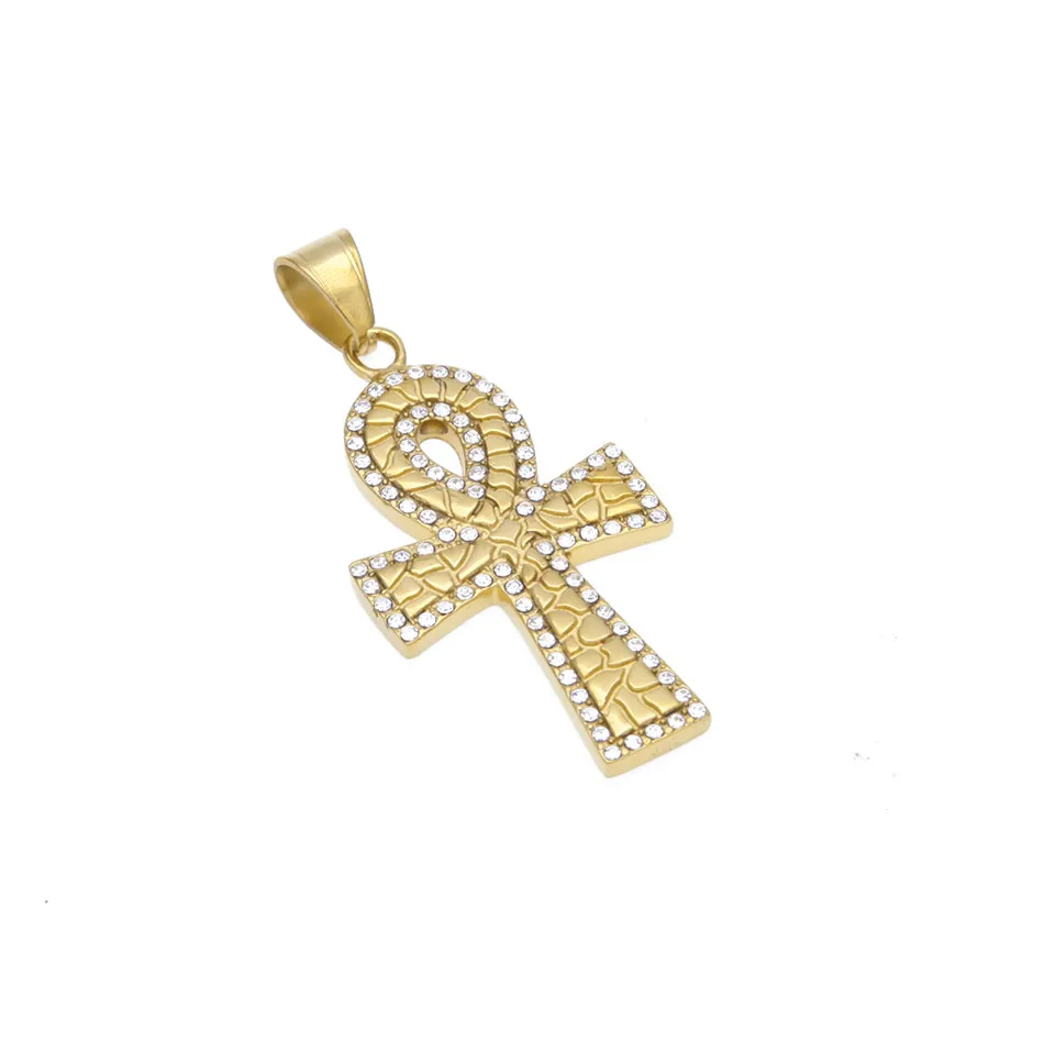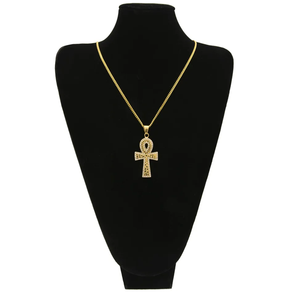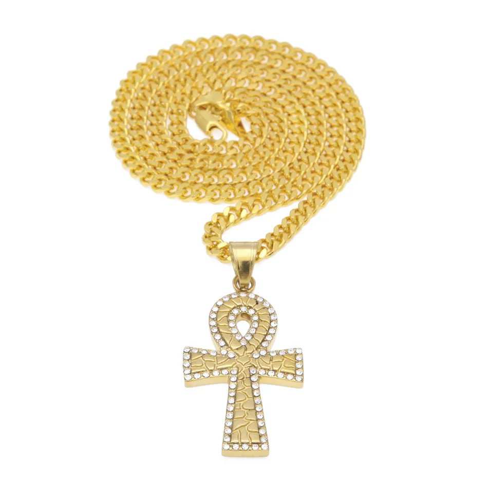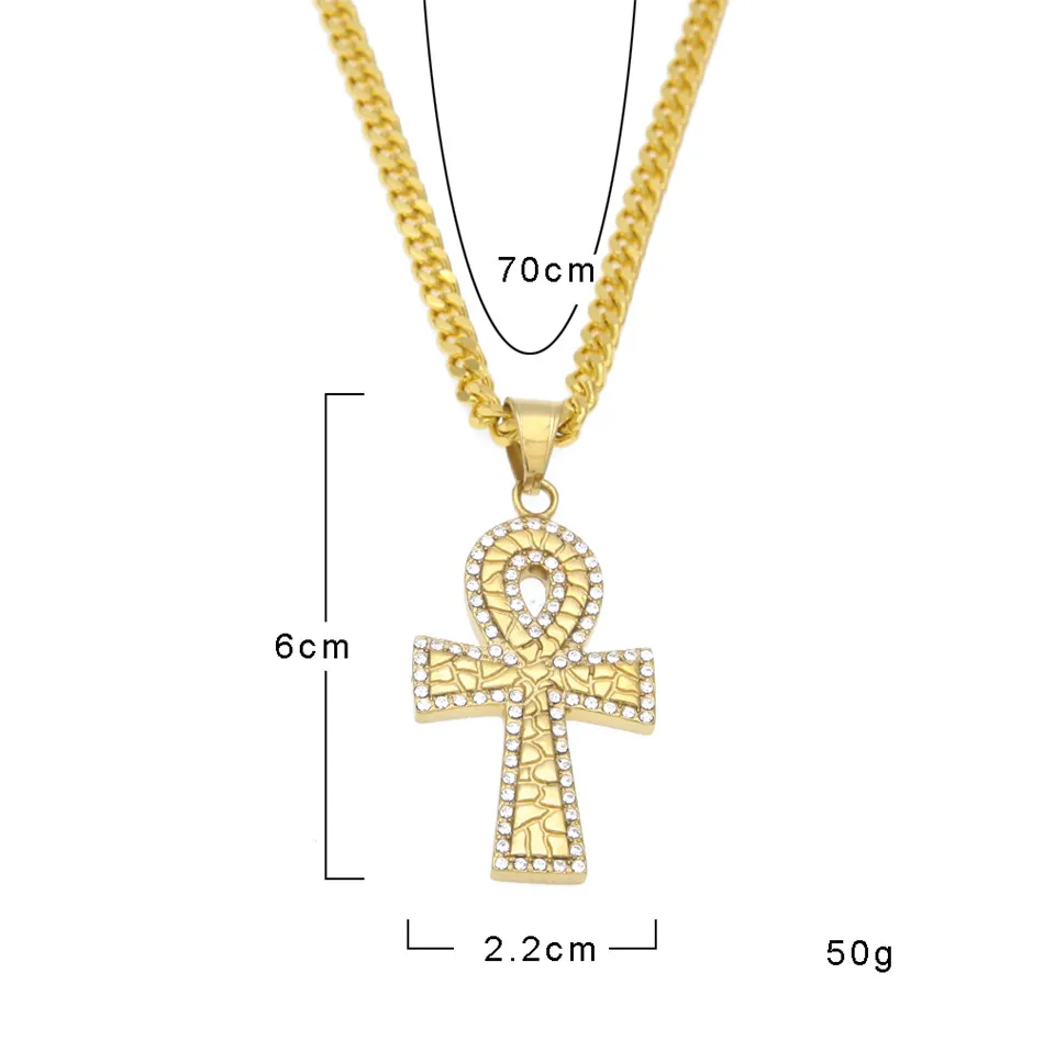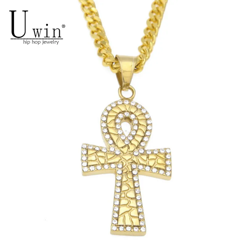 Promo UWIN Men Women Ankh Keys Cross Necklace Egyptian Jewelry Bling Rhinestone Gold Color Stainless Stee